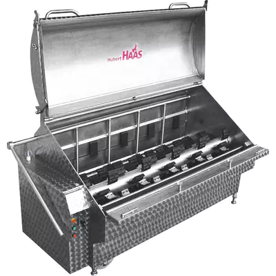 Pro opracování selat a prasat do hmotnosti max. 200 kg robustní žárově zinkovaná konstrukce stroje jednoválcové provedení pro velmi účinné odstraňování štětin topná tělesa umístěná v olejové lázni s přesnou regulací teploty tepelná setrvačnost olejové lázně udržuje stálou teplotu vody jednostranné otvírání (přední víko) ovládání zařízení je umístěno na pravé straně vyklápění pomocí mechanického hrabla odpad vody vždy na protilehlé straně vůči ovládání 80 speciálních gumových škrabek pojízdné provedení