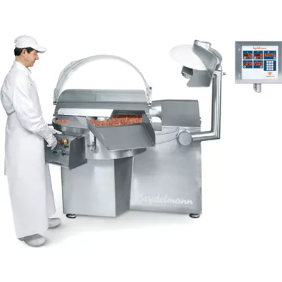 Vysoce výkonný průmyslový kutr K 96 AC-8 masivní celonerezová mísa s objemem 90 litrů 6 plynule nastavitelných rychlostí nožové hřídele 2 zpětné míchací rychlosti 2 nezávislé rychlosti otáčení mísy hlavní motor s vestavěným ventilátorem a příkonem 60 kW, krytí IP 54 6-nožová vyměnitelná hlava s precizním vyvažováním frekvenčně řízený hlavní pohon s inteligentní regulací výkonu hydraulicky ovládané hlavní víko, vyhazovač, resp. překlapěč hydraulický vyhazovač pro účinné vyprazdňování i tekutého díla průhledné protihlukové víko ze speciálního plexi křížové ovladače logicky umístěné na obslužném panelu stativ stroje je kompletně uzavřený proti vodě digitální ovládání Command 1000 v samostatné nerezové skříňce vysoce hygienické zcela zapuštěné kryty bez gumových těsnění samostatný rozvaděč z nerezové oceli s řídící elektronikou celonerezová konstrukce pro velmi účinné tlumení hluku Mikroprocesorové digitální řízení COMMAND 1000 umístěno v nerezové skříňce s krytím IP 66 s možností upevnění na stěnu mimořádně velký přehledný displej pro snadné čtení údajů o stavu kutru nastavování limitních teplot pro vypnutí kutru nastavování počtu otáček mísy pro vypnutí kutru zobrazení okamžitého stavu kutru (otáčky nožové hlavy, otáčky mísy, teploty, vyznačení zařazené rychlosti, celkový počet otáček mísy atd.) zobrazení servisních ukazatelů (přetížení motoru či jeho přehřátí) zobrazení údržby a servisních intervalů 5 m propojovacího kabelu mezi strojem a mikroprocesorem Volitelné vybavení vypínací kontakty pro dobu chodu a teplotu (9+9) hydraulický překlapěč 120 l vozíků na levé straně nožový systém S 24 s rychlou výměnou nožů sada nožů S 24 typ K pro vysoký stupeň emulgování sada nožů S 24 typ V pro univerzální použití (emulgování i fermentované výrobky)