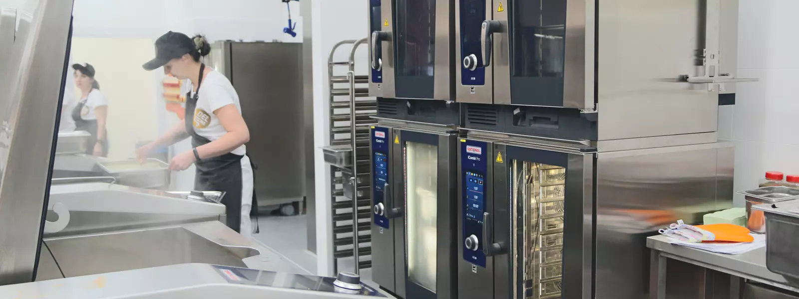 Moderní kuchyň v Jíídelně zvládne připravit přes 800 jídel denně a díky otevřenému konceptu umožňuje zákazníkům nahlédnout přímo na proces vaření. Špičkové vybavení, jako jsou konvektomaty a pánve Rational, fritézy Bertos, gril na kuřata a pec na pizzu, zajišťuje efektivní a kvalitní přípravu pokrmů. Tento koncept spojuje profesionalitu, pořádek a příjemné prostředí pro zákazníky i kuchaře.